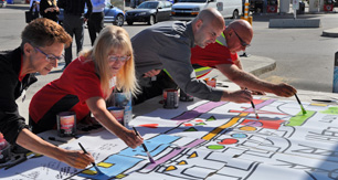 7. Install shower walls. Cut a hole for the shower faucet. Using a tub surround adhesive, like PL700, add glue to the back of the shower walls and lift into place, ensuring they are straight. Let dry for at least 24 hours so they won't shift when you install the glass.